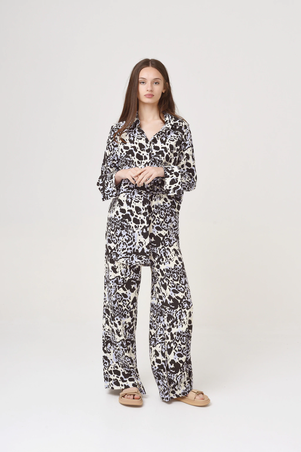 Pantalón semioxford confeccionado en poplin liviano estampa animal print. Posee elástico en la cintura y cinta a tono que permite ajustar su calce
