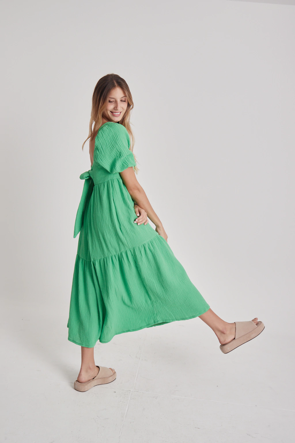 Vestido largo confeccionado en gasa doble. Con escote escote recto, Mangas balloon con frunces en hombros y puños con elastico que aportan volumen. cuenta con recortes y volados.